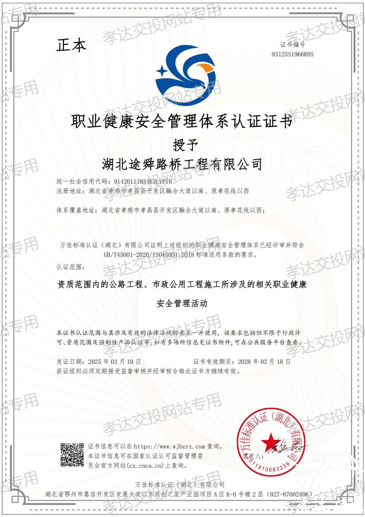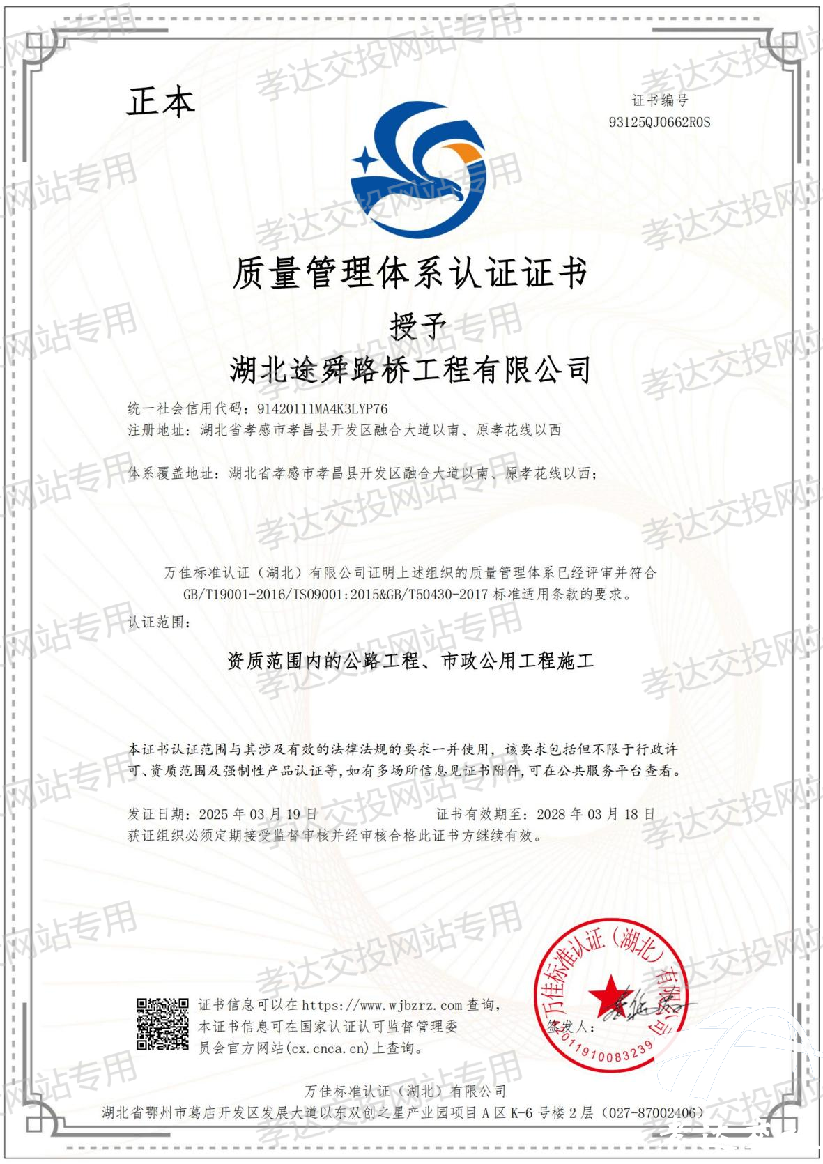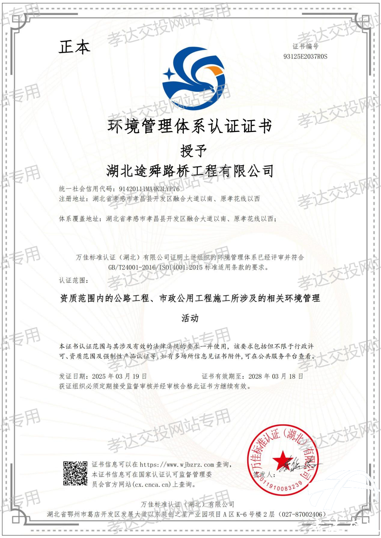发布时间: 2025-03-21 17:47:263月19日,FUN88乐天使全资子公司——湖北途舜路桥工程有限公司,在顺利通过中国质量认证中心万佳标准认证中心《质量、环境和职业健康安全管理》三标体系认证审核后,取得三标管理体系认证证书。